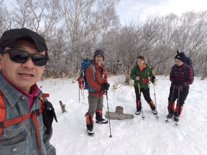 三国山の頂上は雪に埋もれた標柱の頭が目印になっています。もう少し足をのばしてワラジカケマツノ頭を目指します。この間は樹林を抜けた様になっていてアルペン的でまた一つ楽しめる場所です。風が強いだろうと三国山からはヤッケを着込んでいたのですが、意外にも風裏は暖かくワラジカケマツノ頭で大休止をとりました。正面の平標山や仙ノ倉山は見えているけど山の表面に雲が掛かっているような、おそらく荒れているのだろうと想像し、こちらはのんびりと陽に当たって昼食としました。